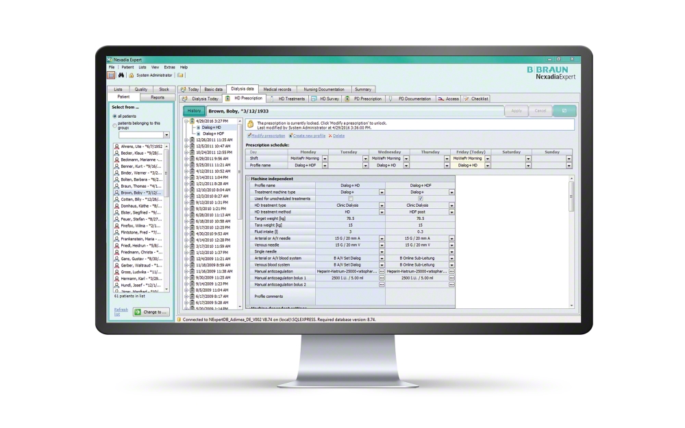 NEXADIA® expert Standard version includes several modules: Patient homepage, administration data, medical data, HD survey, patient status|clinical cases, dialysis today, HD prescription data, HD treatment, data, checklists, diagnosis, medications, summary and laboratory value calculation.